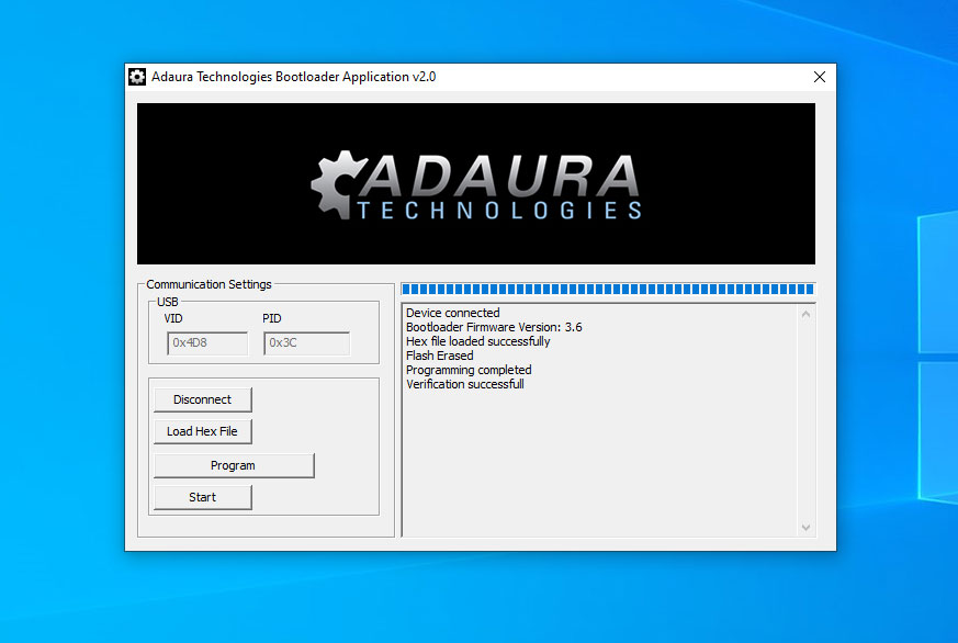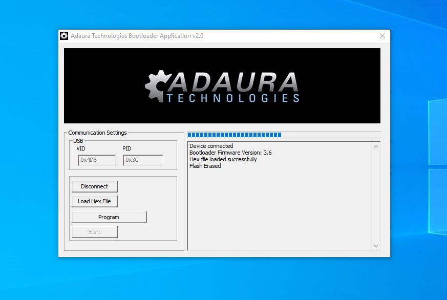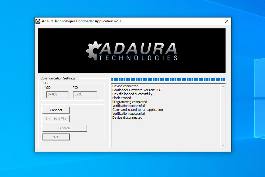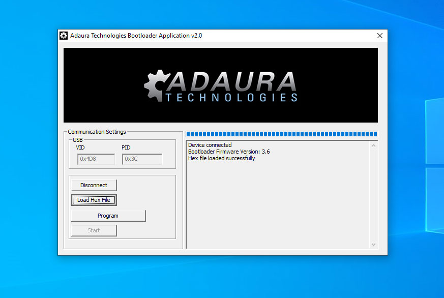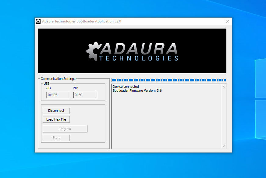 Open the Adaura Bootloader desktop application and press the Connect button.