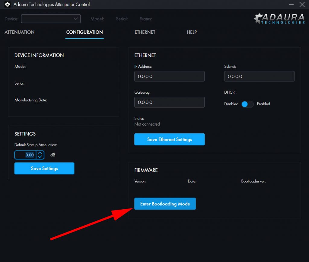 Enter bootloading mode by starting the AdauraControl desktop application and navigating to the Configuration tab.
